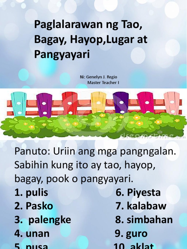 Ito ay ginagamit panghalili or pamalit sa ngalan ng tao bagay pook o pangyayari. Panghalip na Pamanggit Relative Pronoun - Ito ay kataga o parirala ng tagapag -ugnay ng dalawang kaisipan o pananalita. FILIPINO 3 PANG-URI PAGLALARAWAN NG TAO HAYOP BAGAY AT LUGAR SA PAMAYANAN MODULE WEEK 8 Pinakabagong balita tungkol sa maikling paglalarawan ng pamayanan.