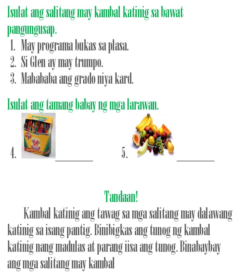 These worksheets ask the learner to match a 3-letter syllable to another 3-letter syllable to create a Filipino word. Ang patinig ay isang silabikong tunog sa pananalita na binibigkas nang walang anumang paghihigpit sa daanan ng boses. LAWIT-tulang pasalaysay na may sukat na labindalawang12 pantig at may mga pangyayaring hango sa tunay na.