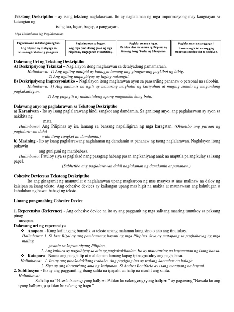 Ang tekstong ito ay laging sumasagot sa tanong na Ano. En este video te explico acerca del TEXTO DESCRIPTIVO su concepto las clases de descripciones y los pasos para elaborar una descripción. Malalawak ang kabukiran kagubatan at karagatang nagtataglay.