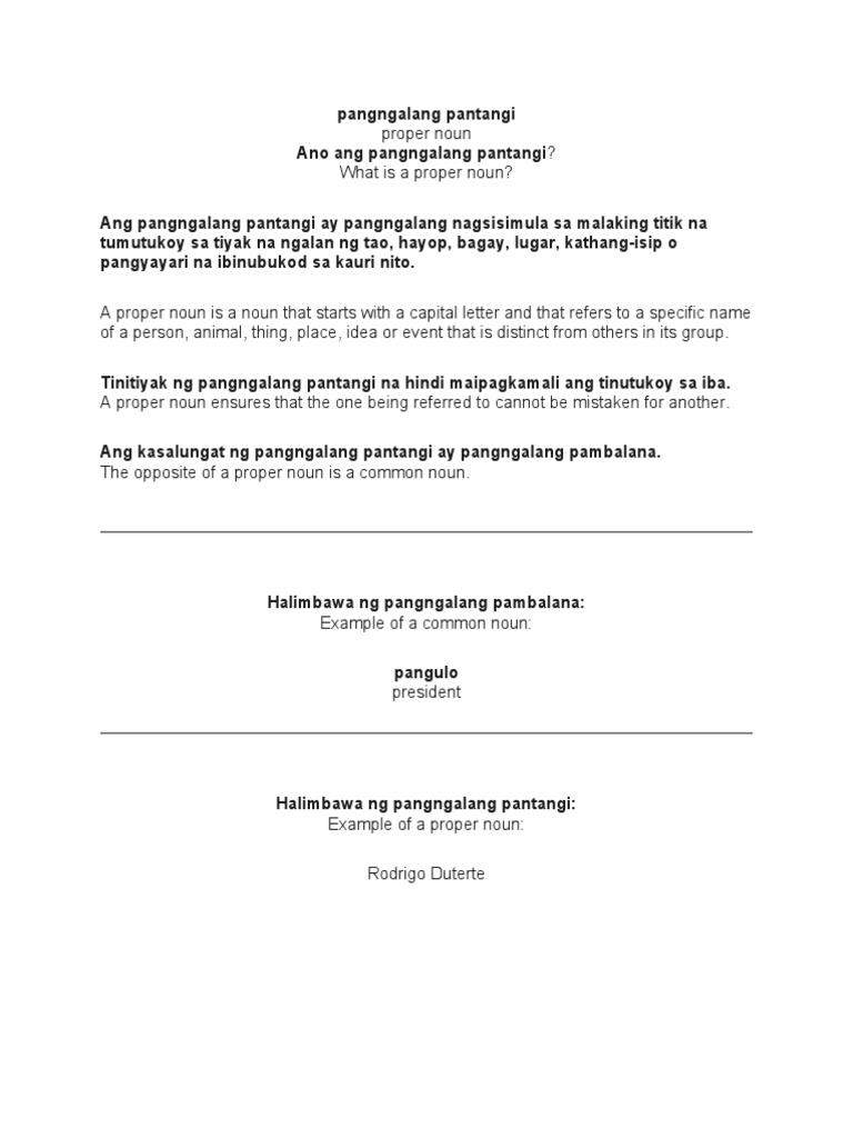 Pangngalang pantangi na bagay. A proper noun is a word that names a particular person thing animal or place. Ang pangngalang pantangi ay tumutukoy sa tiyak na ngalan ng tao bagay hayop pook o pangyayari. May dalawang uri ang pangngalan.